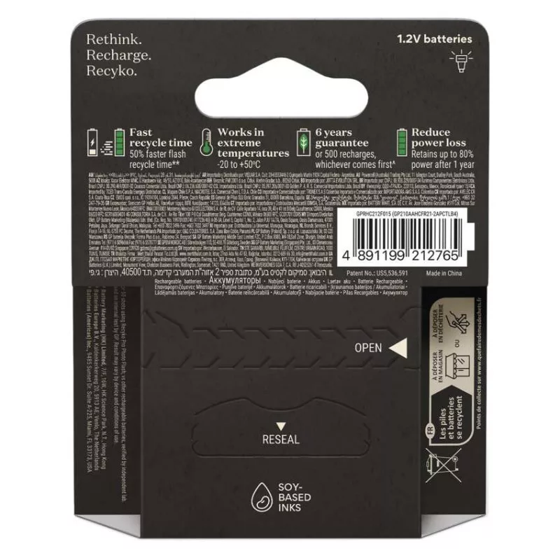 akkumulátor mérete: AA|értékesítési csomagolás: 4 db, kis papír doboz|feszültség: 1,2 V|kapacitás: 2 000 mAh|kategória/sorozat: ReCyko Pro|kémiai összetétel: NiMH|márka: GP|max. tárolási idő: nincs megadva|méretek: 14,5 × 50,5 mm|súly: 30 g|típus: HR6 (AA ceruza)|töltési ciklusok száma: több, mint 500|tölthető: igen|üzemi hőmérséklet: -20 °C és +50 °C