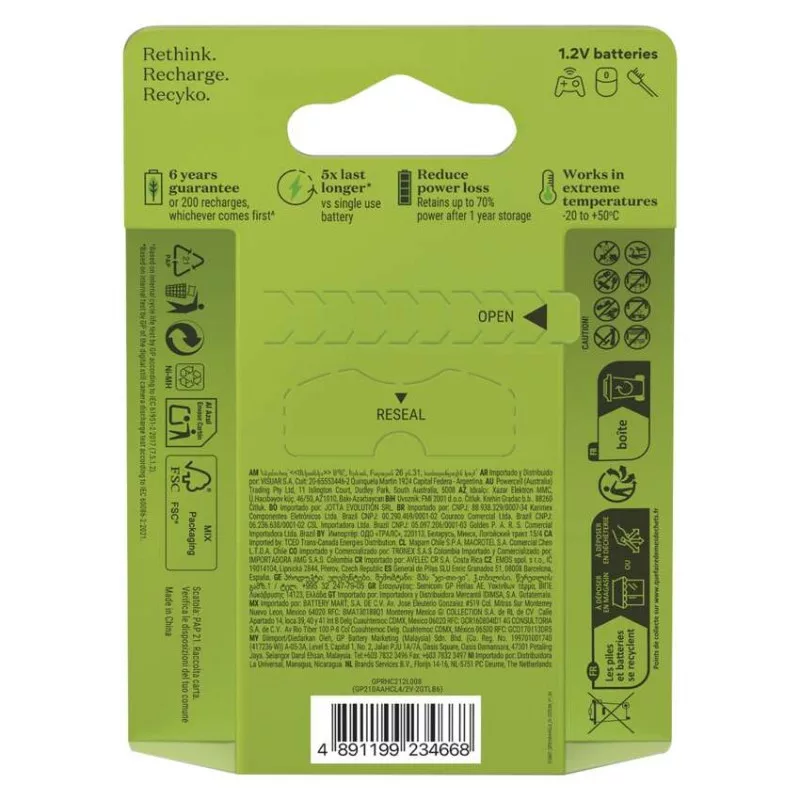 akkumulátor mérete: AA|értékesítési csomagolás: 6 db, kis papír doboz|feszültség: 1,2 V|kapacitás: 2 100 mAh|kategória/sorozat: Tölthető|kémiai összetétel: NiMH|márka: GP|max. tárolási idő: nincs megadva|méretek: 14,5 × 50,5 mm|súly: 23 g|típus: HR6 (AA ceruza)|töltési ciklusok száma: több, mint 200|tölthető: igen|üzemi hőmérséklet: -20 °C és +50 °C