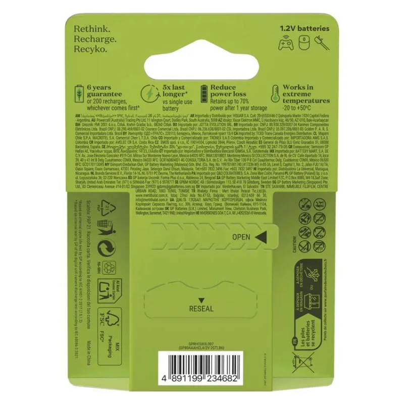 akkumulátor mérete: AAA|értékesítési csomagolás: 6 db, kis papír doboz|feszültség: 1,2 V|kapacitás: 800 mAh|kategória/sorozat: Tölthető|kémiai összetétel: NiMH|márka: GP|max. tárolási idő: nincs megadva|méretek: 10,5 × 44,5 mm|súly: 12 g|típus: HR03 (AAA mikroceruza)|töltési ciklusok száma: több, mint 200|tölthető: igen|üzemi hőmérséklet: -20 °C és +50 °C