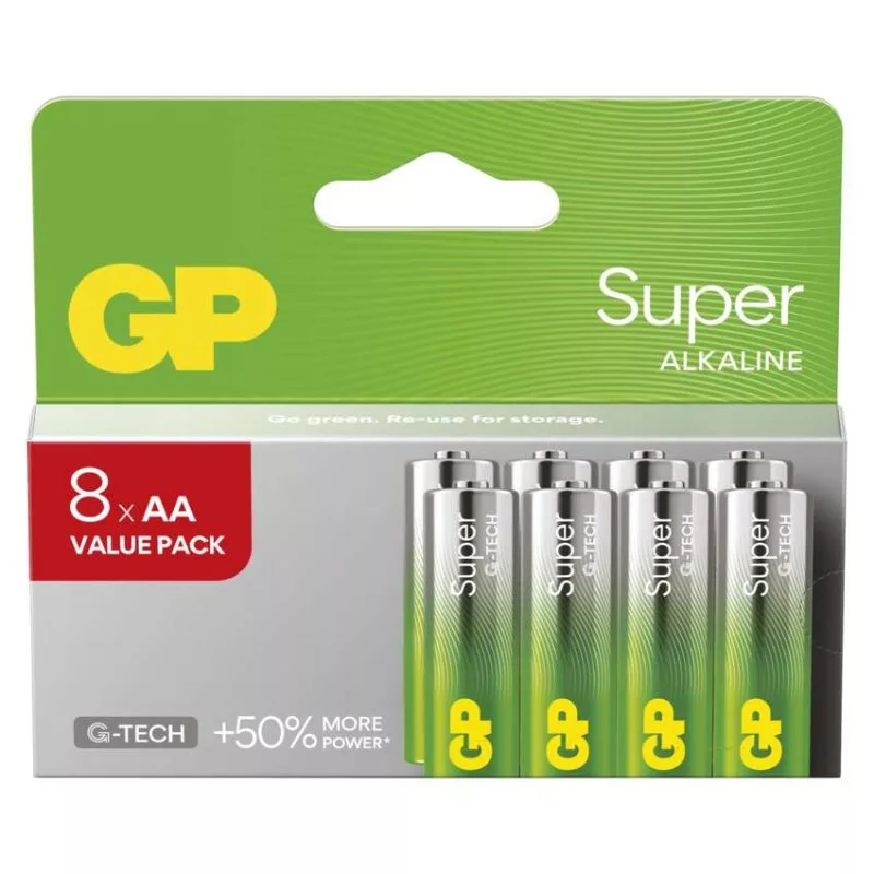 akkumulátor mérete: AA|értékesítési csomagolás: 8 db, kis papír doboz|feszültség: 1,5 V|kapacitás: nincs megadva|kategória/sorozat: Super Alkaline|kémiai összetétel: alkáli|márka: GP|max. tárolási idő: 10 év|méretek: 14,5 × 50,5 mm|súly: 23 g|típus: LR6 (AA ceruza)|töltési ciklusok száma: nem tölthető|tölthető: nem|üzemi hőmérséklet: -18 °C és +50 °C