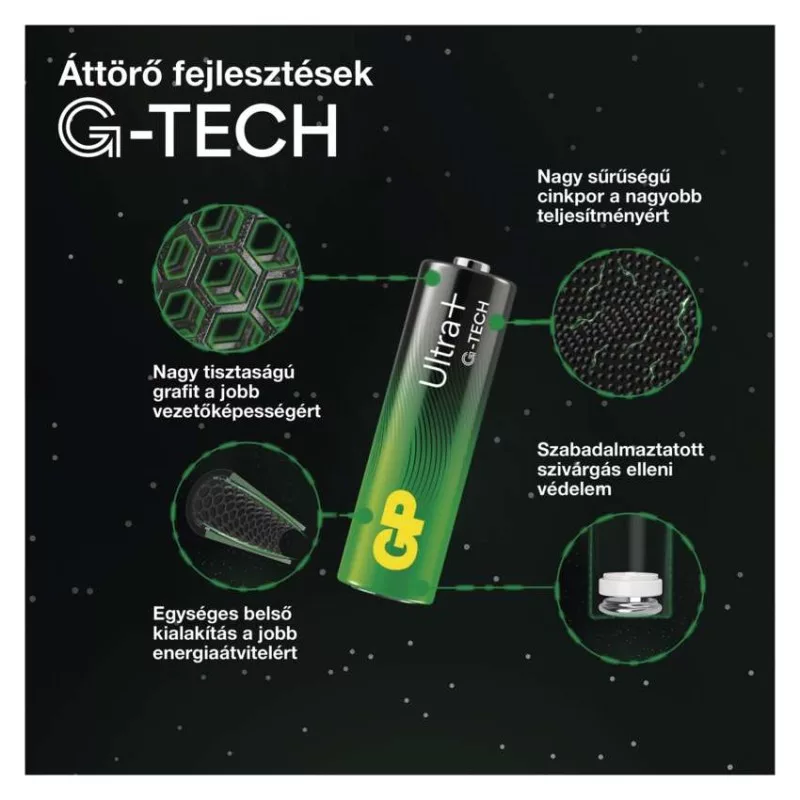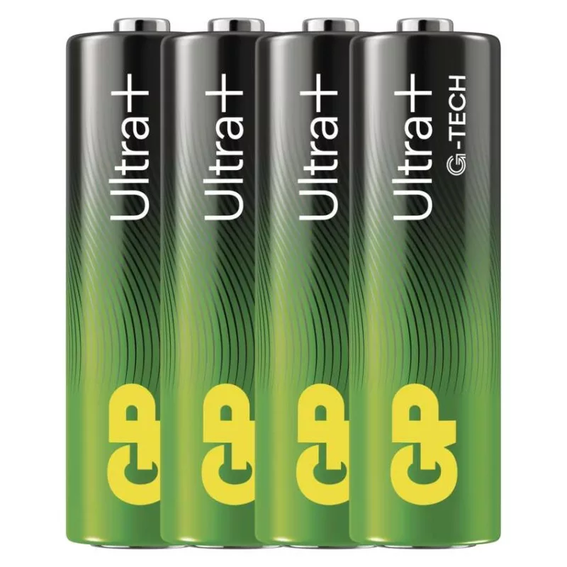 akkumulátor mérete: AA|értékesítési csomagolás: 4 db, kis papír doboz|feszültség: 1,5 V|kapacitás: nincs megadva|kategória/sorozat: Ultra Plus Alkaline|kémiai összetétel: alkáli|márka: GP|max. tárolási idő: 10 év|méretek: 14,5 × 50,5 mm|súly: 24 g|típus: LR6 (AA ceruza)|töltési ciklusok száma: nem tölthető|tölthető: nem|üzemi hőmérséklet: -20 °C és +54 °C