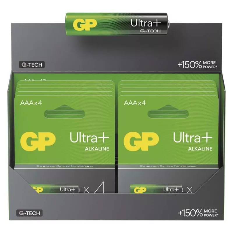 akkumulátor mérete: AAA|értékesítési csomagolás: 4 db, kis papír doboz|feszültség: 1,5 V|kapacitás: nincs megadva|kategória/sorozat: Ultra Plus Alkaline|kémiai összetétel: alkáli|márka: GP|max. tárolási idő: 10 év|méretek: 10,5 × 44,5 mm|súly: 13 g|típus: LR03 (AAA mikroceruza)|töltési ciklusok száma: nem tölthető|tölthető: nem|üzemi hőmérséklet: -20 °C és +54 °C