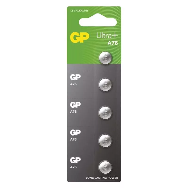 akkumulátor mérete: nincs megadva|értékesítési csomagolás: 5 db, bliszter|feszültség: 1,5 V|kapacitás: 110 mAh (1,6 kohm-os terhelés esetén)|kategória/sorozat: Alkaline cell|kémiai összetétel: alkáli|márka: GP|max. tárolási idő: 3 év|méretek: 11,6 × 5,4 mm|súly: 1,7 g|típus: GP A76F (AG13, LR44, LR1154, V13GA, PX76A)|töltési ciklusok száma: nem tölthető|tölthető: nem|üzemi hőmérséklet: 0 °C és +45 °C