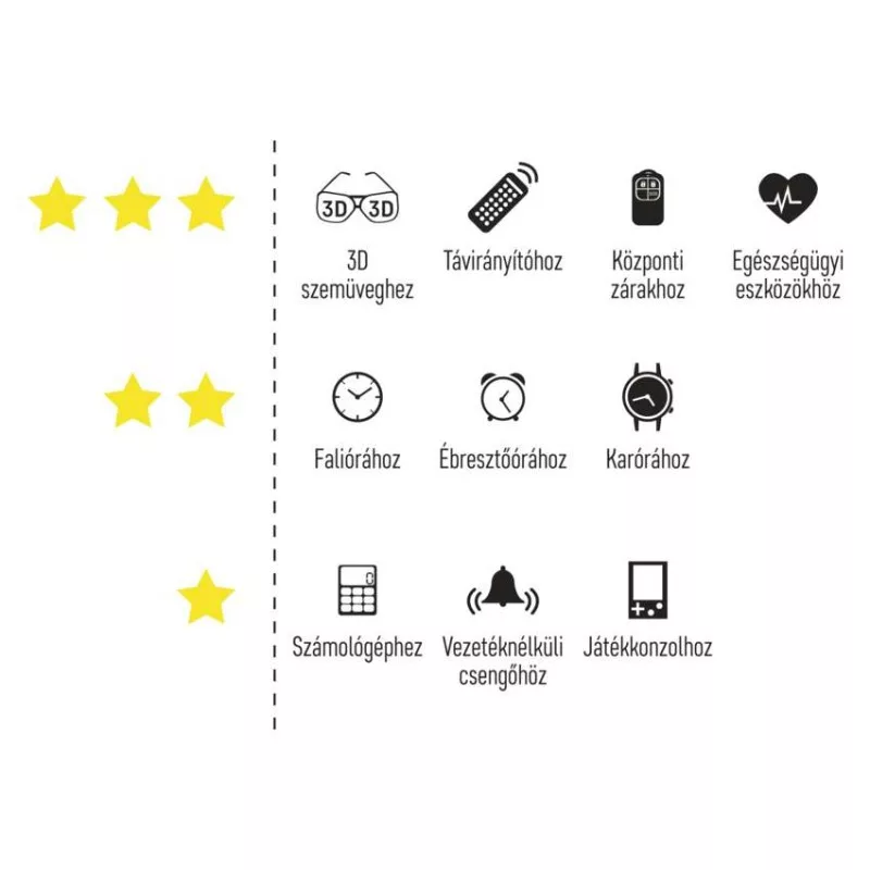 Különösen széles, -10 °C és +60 °C közötti működési hőmérséklet-tartomány.Megfelel az érzékeny eszközökben történő használatra, mint például: karórák, számológépek, biztonsági világítás, gépkocsiriasztók, nyomásmérők, távirányítók és egyebek. Különösen hosszú, akár 10 éves eltarthatósági idő.