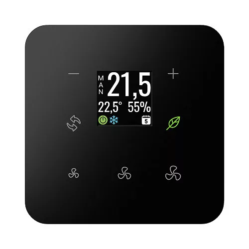 Az iNELS épületautomatizálási és a vendégszoba-kezelő (GRMS) rendszer üvegfelületű szobatermosztátja, mely a helyiség hőmérséklet szabályzásához használható. Dizájnos fekete üveg felület, ívelt sarokkialakítással.