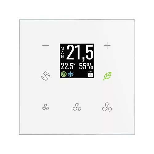 • Érintőgombjainak funkciója szoftveresen módosítható, pl. fan-coil kikapcsolása, komfort fűtés/hűtés üzemmód, stb.