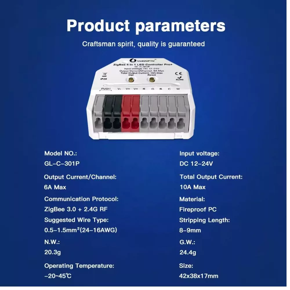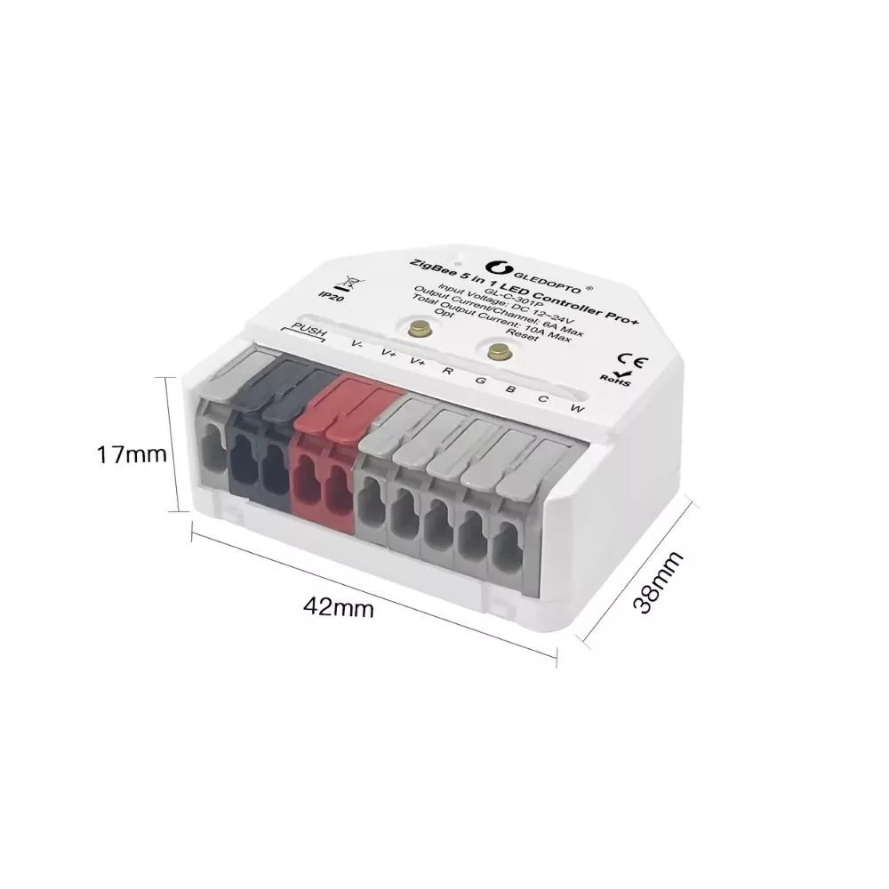 A Gledopto GL-C-301P Ultra Mini RGB+CCT LED-vezérlő az egyik legkisebb okos LED vezérlő a piacon. Fejlett Zigbee 3.0 protokolljának köszönhetően ez a vezérlő zökkenőmentesen integrálható a népszerű okosotthon rendszerekkel, lehetővé téve a felhasználók számára, hogy az RGB+CCT (színes + fehér színhőmérséklet állítással) LED-szalagokat precízen és könnyedén irányítsák. Ez az 5 csatornás vezérlő támogatja mind a 12V, mind a 24V LED-szalagokat, így rugalmas megoldást kínál különböző világítási beállításokhoz, legyen szó lakossági vagy kereskedelmi alkalmazásról. Kis méretének köszönhetően akár kötődobozokban, hagyományos kapcsolók mögött is telepíthető. Ahogy az összes Gledopto Pro készülék, a Zigbee 3.0 kompatibilitása lehetővé teszi az okosvezérlést és az okosotthon rendszerekbe való integrációt, míg a 2,4 GHz-es RF vevője párosítható Gledopto RF távirányítókkal és vezeték nélküli fali panelekhez helyi távirányításhoz.A GLEDOPTO márkátólA Gledopto a minőségi okos világítási megoldásiról híres, népszerű okosotthon márka, amely kiváló minőségű okos LED izzó és LED lámpa termékeiket kínál. A Zigbee Pro és Zigbee Pro+ kategóriás termékeik mind 2,4GHz-es RF helyi távirányításra, mind Zigbee 3.0 okosvezérlésre egyaránt alkalmasak. A Zigbee Pro termékek különösen széles körű zökkenőmentes integrációt kínálnak, többek között a Philips Hue, a SmartThings Zigbee hubokkal, de más szabványos Zigbee 3.0 átjárókkal is kompatibilis a legtöbb Zigbee Pro megoldásuk.A Gledopto termékei minőségi anyaghasználatukról és kivitelükről, megbízhatóságukról, és a különböző okos otthon ökoszisztémákkal való jó kompatibilitásukról híresek.Termékjellemzők: Zigbee 3.0 kompatibilitás: A GL-C-301P támogatja a Zigbee 3.0-t, biztosítva a megbízható és biztonságos kommunikációt számos Zigbee hubbal, beleértve a Philips Hue-t, SmartThings-t és másokat. RGB+CCT vezérlés: Szabályozza LED-szalagjainak színét és színhőmérsékletét (melegtől a hidegfehérig), ideális dinamikus világítási környezetek kialakításához. 5 üzemmód áll rendelkezésre: RGBCCT / RGBW / RGB / CCT (meleg és hideg fehér) / Dimmer (egyszínű LED-szalagokhoz) Széles feszültségtartomány: Kompatibilis mind a 12V, mind a 24V egyenáramú LED-szalagokkal, rugalmasságot kínálva különböző telepítési követelményekhez. Egyszerű integráció: Ideális okos otthoni rendszerekbe való integrációhoz, lehetővé téve a világítás távoli és automatizált vezérlését. Kompakt dizájn: Kicsi és kompakt kialakítású, könnyen illeszthető különféle telepítési környezetekbe, beleértve a süllyesztett kötődobozokat.Okosotthon protokollok és integrációkA GL-C-301P a Zigbee 3.0-t használja, amely lehetővé teszi a zökkenőmentes integrációt különféle okosotthon ökoszisztémákkal. A készülékhez kompatibilis Zigbee átjáró szükséges a távoli vezérléshez vagy az okosotthon integrációhoz. Csatlakozás után a felhasználók a világításukat olyan népszerű platformokon keresztül vezérelhetik, mint a Philips Hue, SmartThings és más Zigbee-kompatibilis rendszerek.Műszaki adatok Modell: GL-C-301P Feszültség: DC 5V-24V Támogatott LED-szalagok: RGBCCT / RGBW / RGB / CCT (meleg és hideg fehér) / Dimmer (egyszínű LED-szalagokhoz) Kimeneti áram: 6A/csatorna, max. 10A összesen Protokoll: Zigbee 3.0 Vezérlési távolság: 30m (nyílt terület) Működési hőmérséklet: -20°C és 45°C közöttA Gledopto GL-C-301P Zigbee 3.0 RGB+CCT LED-vezérlő kiváló választás azoknak a felhasználóknak, akik szeretnék fokozni okos világítási élményüket precíz vezérléssel és zökkenőmentes integrációval, és egy kicsi, kompakt vezérlőt keresnek.