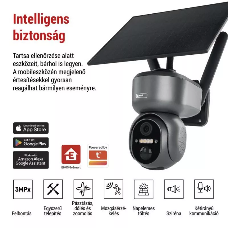 a csomag tartalma: 1× kameraegység, 1× telepítőanyag, 1× kézikönyv|a kamera érzékelőelemei: 3 Megapixel AHD (2048 × 1536)|alkalmazási nyelvek: EN, CZ, SK, PL, DE, HU, SI, FR, + 60 másik nyelven|állatfelismerés: nem|áthidalási idő: akár 8 hónapig|automatikus képtárolás: igen|az érzékelési terület beállítása: igen|egyéb funkciók: nem|éjszakai látásmód: igen, 4× IR LED + fehér LED|emberi test felismerése: igen|értékesítési csomagolás: 1 db, doboz|értesítések a mobilalkalmazáshoz: igen|felhőalapú tárolás: igen|garancia-időszak: 2 év|hangalapú asszisztensek általi vezérlés: igen (Amazon Alexa, Google Assistant)|hangérzékelés: nem|hangkommunikáció: kétirányú|hívás kezdeményezése a gomb segítségével: nem|IR CUT: igen|jelátviteli frekvencia: LTE|kamera felbontása: 2 048 × 1 536|kamera látószöge: 105°|kamera tápegység: Li-ion akkumulátor 10 400 mAh + napelem + DC adapter 5 V/1 A (tartozék)|kompatibilitás: EMOS GoSmart, Tuya, Lidl, Smartlife, nyitott rendszer|lopás elleni védelem: alkalmazás által blokkolva|magasság: 150 mm|maximális éjszakai látótávolság: 10 méter|mélység: 200 mm|motoros forgatás: igen|mozgásérzékelés: igen|mozgásérzékelési szög: 120°|mozgásérzékelési tartomány: 10 m|mozgáskövetés (tracking): nem|ONVIF támogatás: nem|privát üzemmód: nem|protokoll: 4G, LTE|sorozat: GoSmart|szélesség: 75 mm|szerelés: falra|szerelési anyag: igen|szín: #|sziréna: igen|támogatott OS: Android, iOS|tárolás SD-kártyán: igen|tartó típusa: állvány menet|tartozék tápegység: igen|terméktípus: IP kamera|további beltéri monitor: nem|további LED fény: igen|védettség: IP65|WebRTC funkció: igen