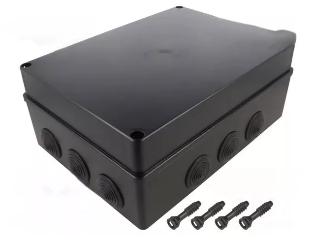 • Termék neve: Kötődoboz, 12 gumi bevezetővel, fekete, 300x220x120mm, IP65, UV-álló