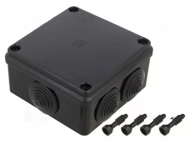 • Termék neve: Kötődoboz, 6 gumi bevezetővel, fekete, 100x100x50mm, IP65, UV-álló