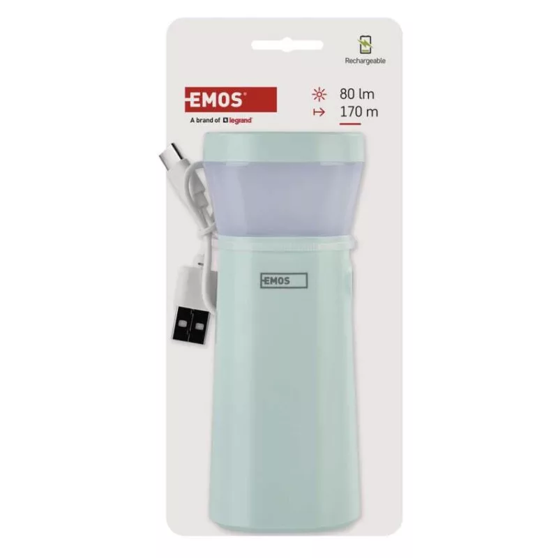 akkumulátor típusa: 800 mAh/3,7 V|anyag: műanyag|a töltés LED jelzése: igen|az akkumulátor állapotának LED-es jelzése: nem|elem a csomag része: igen|értékesítési csomagolás: #|feltöltési idő: 1,5 h|fényáram: LED 100 % – 80 lm, SMD LED 100 % – 70 lm|fényforrás: LED + SMD LED|fókusz: nem|garancia-időszak: 2 év|jellemzők: nincs megadva|márka: EMOS|maximális fényárama: 80 lm|max. világítási távolság: 170 m|méretek: 43 × 55 × 134 mm|speciális funkciók: akkumulátorvédelem|súly: 80 g|szín: kék|táplálás: Li-Ion|tartozékok: USB-C kábel|tölthető: igen|töltőcsatlakozó típusa: USB-C|ütésállóság: igen|üzemidő részletezés: LED 100 % –5 h, SMD LED 100 % – 3,5 h|üzemmódok: LED 100 %, SMD LED 100 %|világítási idő: 3,5–5 óra|világítási távolság: LED 100 % – 170 m, SMD LED 100 % – 7 m|világítási üzemmódok száma: 2|vízálló: nem