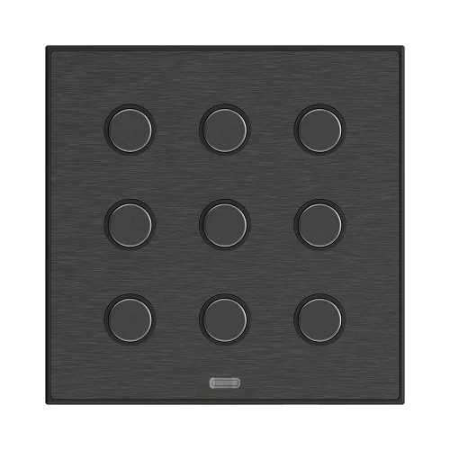 Az iNELS rendszer prémium fém anyagból készült 9 gombos vezérlője - grafitfekete színben, amely elegáns és kényelmes vezérlést biztosít.