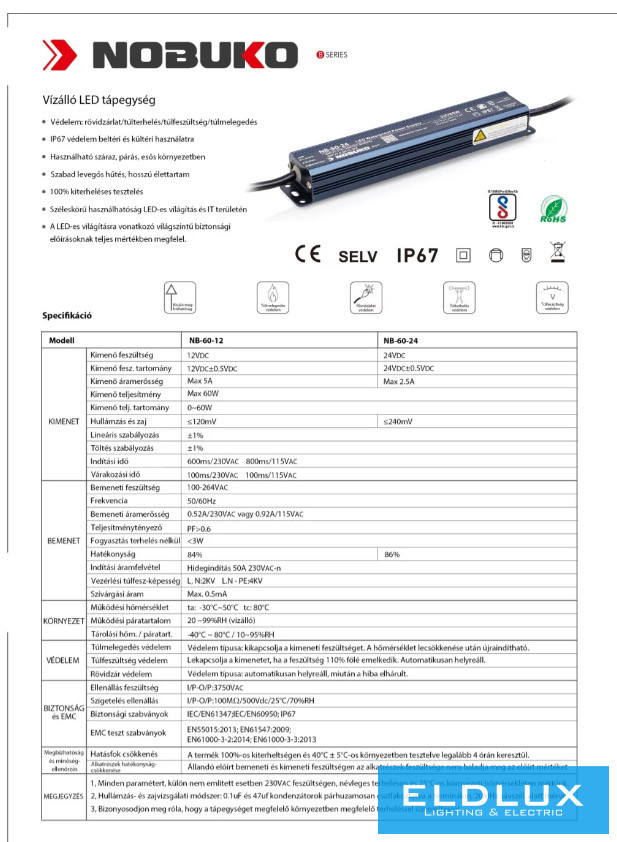 NOBUKO B Series 24V 60W IP67 Kültéri Led Tápegység