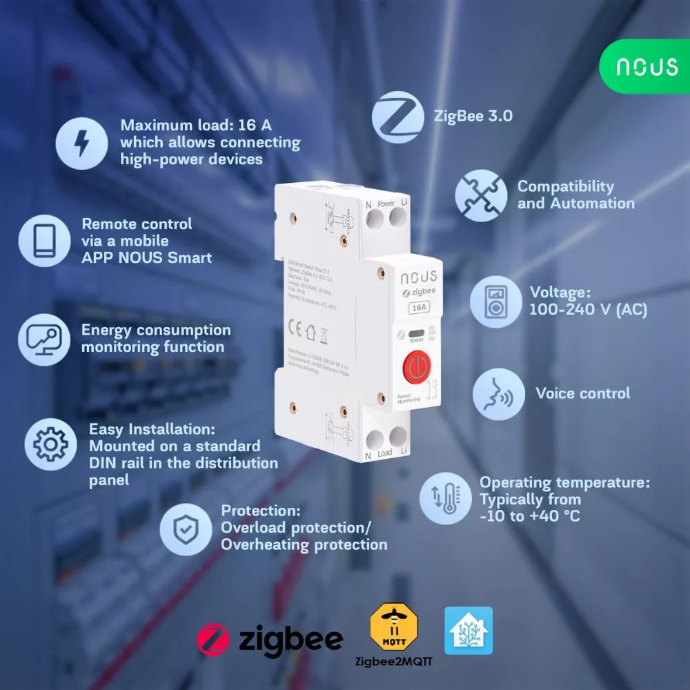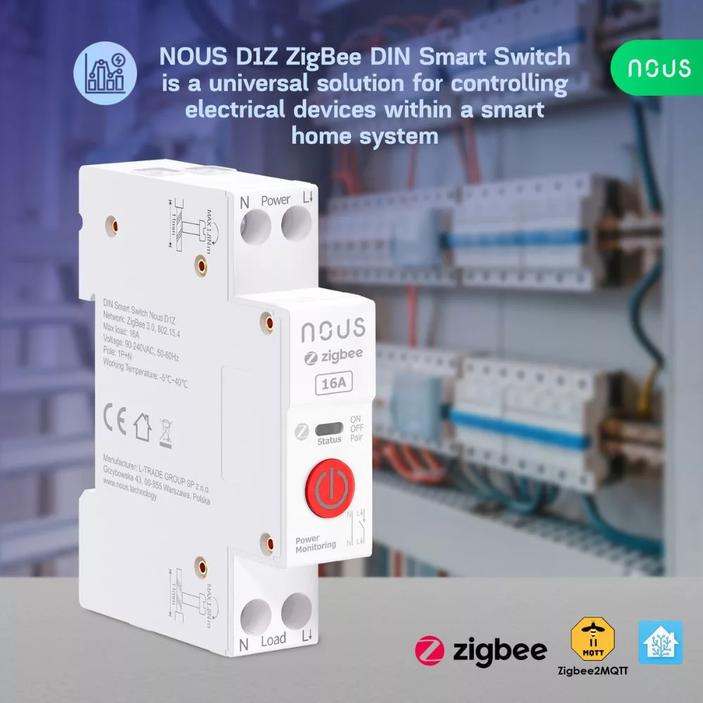 NOUS Tuya Zigbee Megoldásokról A NOUS Zigbee alapú megoldásai a Tuya környezetet használják, amely az okosotthon eszközök egyik ökoszisztémája. A Zigbee protokoll energiatakarékos, a MESH hálózatnak köszönhetően stabil, és lehetővé teszi az eszközök egyszerű, vezeték nélküli csatlakoztatását egy központi átjáróhoz. A NOUS átjárók kompatibilisek a Tuya appal, de párosíthatók a NOUS saját applikációjához is. A Zigbee átjárók feladata, hogy összekössék a Zigbee eszközöket az otthoni Wi-Fi hálózattal, így távoli vezérlést és automatizálást biztosítanak. NOUS ÁtjáróA NOUS átjárók pl. NOUS E1 központi szerepet töltenek be az okosotthonodban. Ezek az eszközök biztosítják, hogy minden Tuya Zigbee-kompatibilis eszköz, például okos kapcsolók, termosztátok, érzékelők és fényforrások vezérlései zökkenőmentesen működjenek együtt.A NOUS D1Z egy Zigbee-s DIN sínre szerelhető okos relémodul, amely lehetővé teszi a hozzá csatlakoztatott eszközök távoli és automatikus vezérlését okostelefonon vagy tableten keresztül. A készülék mechanikus gombbal és állapotjelző LED-del rendelkezik, valamint egy elektromechanikus relével van felszerelve. Ez egy Zigbee-s okosrelé, így a működtetéséhez mindenképpen Zigbee átjáróra lesz szükséged. Ez a termékvariáns 16A-es maximális áram kapcsolására képes.Főbb jellemzők Távoli vezérlés és monitorozás:Kapcsold be vagy ki az eszközöket az okostelefonodról, bárhol is tartózkodsz. Ez az okos eszköz lehetővé teszi az energiafogyasztás valós idejű ellenőrzését is. Időzítési és automatizálási lehetőségek:Beállíthatsz időzített kapcsolásokat, vagy automatizálhatod a működést például napszak vagy egyéb feltételek alapján. Ennek lehetőségei nagyban függenek a központi egység funkcióitól. Hangvezérlés támogatása:A NOUS D1Z kompatibilis az Amazon Alexa és a Google Asszisztens rendszerekkel, így akár hangvezérléssel is irányíthatod az eszközöket (ZigBee központtól függően). Kompakt kialakítás:A DIN sínre szerelhető modul tökéletesen illeszkedik a villamos elosztó szekrényekbe, helytakarékos és praktikus megoldást kínálvaIntegráció és kompatibilitás: A NOUS D1Z kompatibilis a Nous Smart Home alkalmazással, amely lehetővé teszi az eszközök egyszerű vezérlését és automatizálását. A Zigbee protokollnak köszönhetően más Tuya-kompatibilis Zigbee átjárókkal is használható, így könnyedén integrálható meglévő okosotthon rendszeredbe.Műszaki adatok: Tápfeszültség: 110-240V ACProtocol: 802.15.Kommunikáció: Zigbee 3.0 protokoll (Tuya) Maximális terhelés: 16ABekötés: L + NKapcsolható relék száma: 1P Működési hőmérséklet: -5 ~ +40 Kompatibilitás: Nous Smart Home alkalmazás (Android/iOS), Tuya ZigbeeMéterek: 82mm x 66mm x 16mmIP védettség: IP20Megjegyzés: A készülék csatlakoztatásához Zigbee átjáróra van szükség (pl. Nous E1 vagy más Tuya-kompatibilis Zigbee átjáró).A NOUS D1Z okos relémodullal kényelmesen és biztonságosan vezérelheted otthonod elektromos készülékeit, bárhol is legyél.