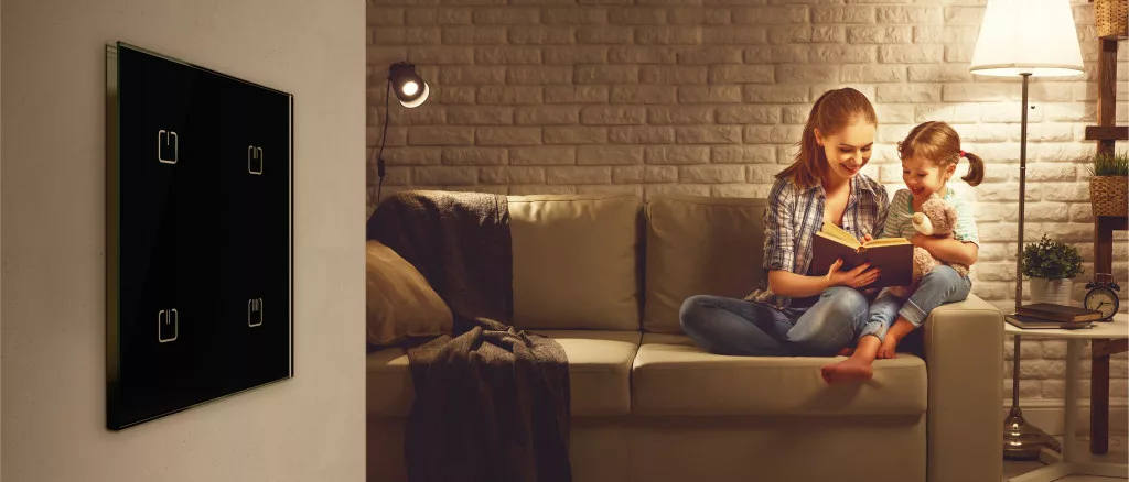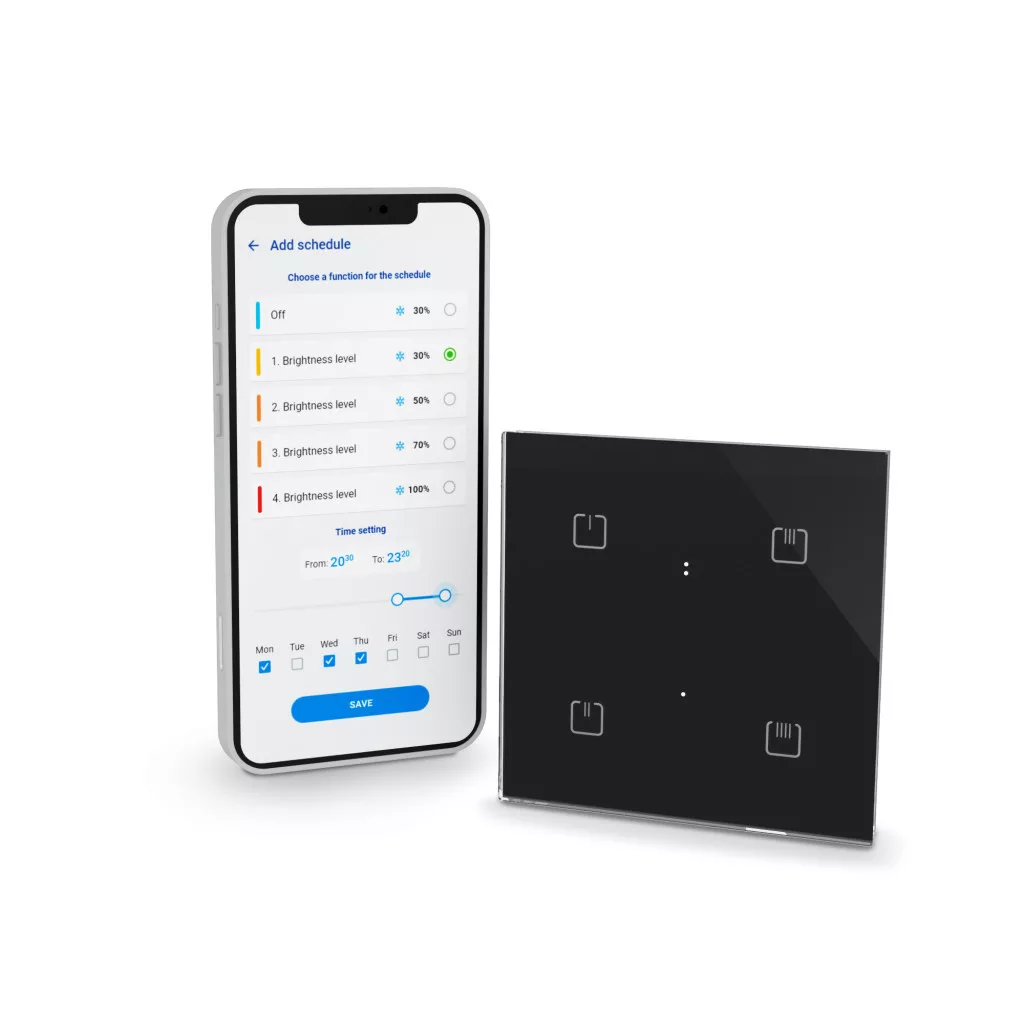 Az iNELS Wireless dimmerrel ellátott üveg vezérlője fényforrások fényáramának szabályozására szolgál. Fekete, szögletes sarokkialakítású kivitelben.