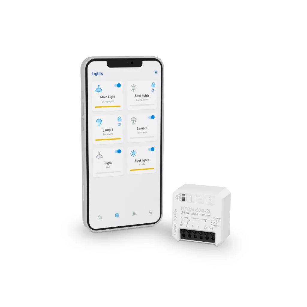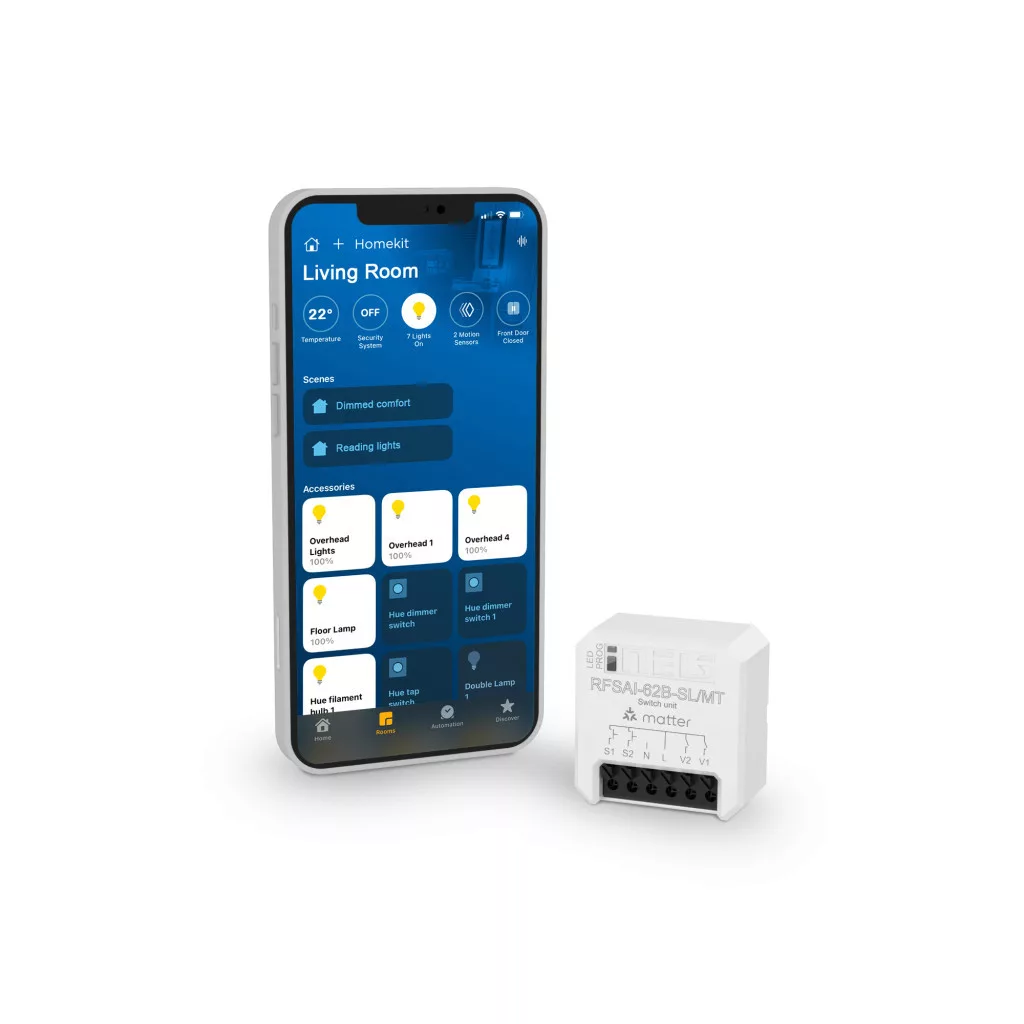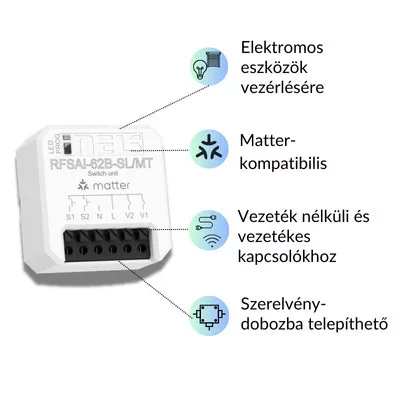 Kétcsatornás, hatfunkciós vezeték nélküli kapcsolóegység külső nyomógomb bemenetekkel. A vezérléshez vezeték nélküli vezérlők használhatók (pl. RFGB-40-MT), valamint a meglévő vezetékes kapcsolók/nyomógombok. A Thread protokoll garantálja a kompatibilitást más Matter-kompatibilis termékekkel.