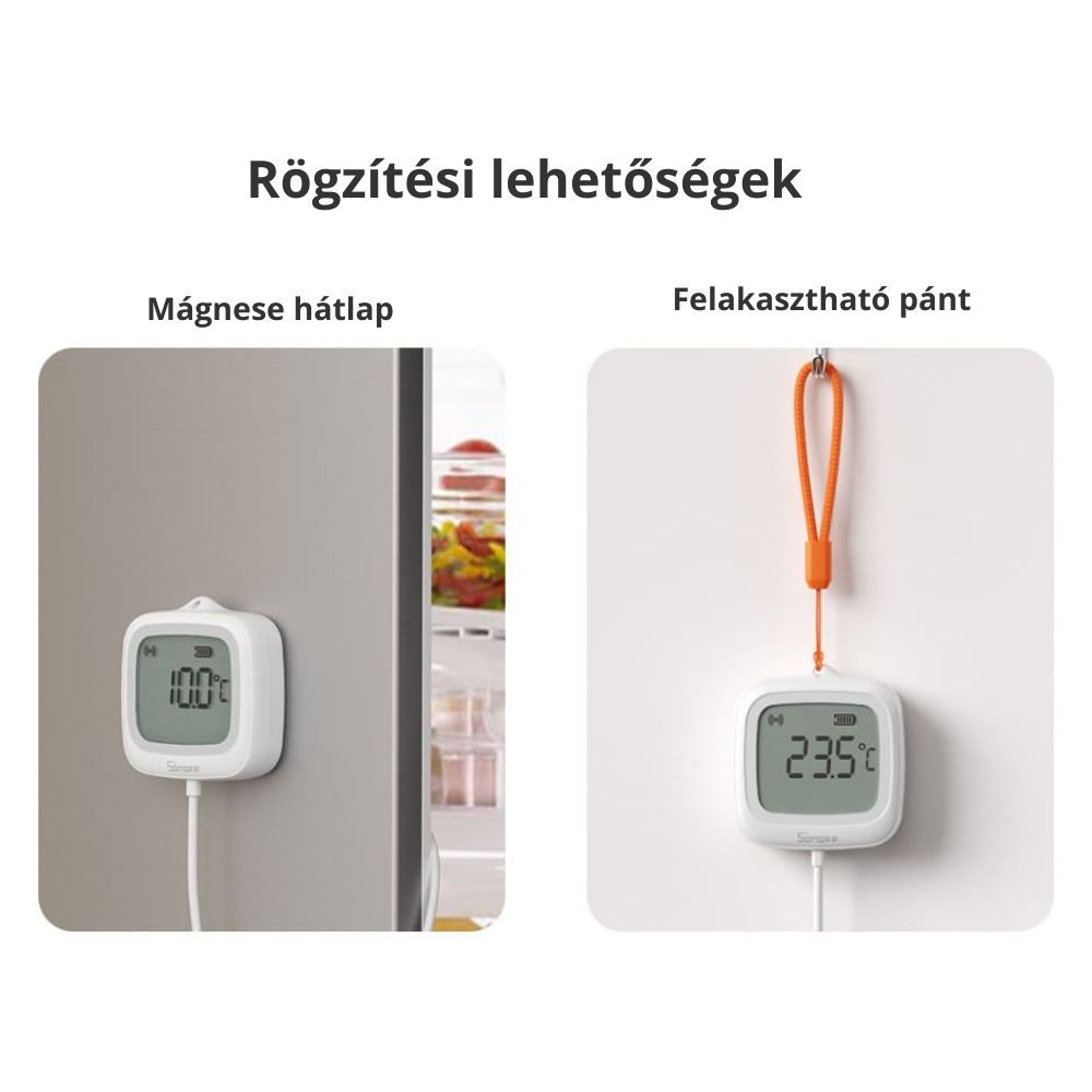 Sonoff Zigbee LCD okos hőmérő – érzékelőszondás változat (SNZB-02LD)A SNZB-02LD egy Zigbee-kompatibilis, LCD kijelzős okos hőmérő, amely IP65 védelemmel rendelkezik, így párás, fröccsenésveszélyes környezetben is megbízhatóan működik. Az eszköz érzékelőszondája 304-es élelmiszeripari rozsdamentes acélból készült, ami ellenáll a magas és alacsony hőmérsékletnek. A 2,2 hüvelykes LCD kijelzőn jól olvasható a pillanatnyi hőmérséklet °C-ban vagy °F-ban. UV-álló kivitele miatt hosszú távon is ellenáll a közvetlen napfénynek. Az 1,5 méteres érzékelőszonda lehetővé teszi zárt terek vagy folyadékok hőmérsékletének mérését – olyan helyeken is, ahová a hagyományos szenzorok nem férnek be. A SNZB-02LD kompatibilis a Zigbee 3.0 protokollt használó központi egységekkel, például: SONOFF iHost, NSPanel Pro, ZBBridge-P, ZBBridge-U, ZBDongle-E, ZBDongle-P, valamint Echo 4. generáció, Echo Show 2. generáció, Echo Plus 2. generáció. Továbbá open-source platformokkal, mint a Home Assistant, is integrálható a SONOFF ZBDongle sorozat segítségével – így könnyedén építhetsz saját, testreszabott hőmérséklet-figyelő rendszert.Az eWeLink alkalmazásban napi, havi vagy féléves bontásban is visszanézheted a hőmérsékleti adatokat, akár 180 napos tárolási kapacitással. A grafikonokat tetszés szerint megoszthatod vagy exportálhatod.. Az appon belül okos jeleneteket hozhatsz létre, értesítéseket kaphatsz a rendellenes hőmérsékletről, vagy automatizálhatod az eszközöket a mért értékek alapján.Élelmiszerbiztonság, kisállat-tartás, borok tárolása vagy üvegházak hőmérsékletének szabályozása – a SNZB-02LD pontos és okos megoldást nyújt, minden helyzetre. Termékváltozatok a Sonoff SNZB-02P az érzékelő beltéri, nem IP-védett, és kijelző nélküli változata; a Sonoff SNZB-02D a szonda nélküli érzékelő beltéri, nem IP-védett változata; a Sonoff SNZB-02WD pedig szintén egy IP65 / kültéri, de érzékelőszonda nélküli termékváltozat. Főbb jellemzők Nagy, jól olvasható LCD kijelző: valós idejű hőmérséklet értékek megjelenítése. Külső érzékelőszonda: pontosabb mérésekhez, különösen olyan helyeken, ahol a levegő lassabban cserélődik. Zigbee 3.0 protokoll: stabil, megbízható kapcsolat, okos otthon rendszerbe integrálható. Valós idejű értesítések: ha a hőmérséklet vagy páratartalom kilép a beállított tartományból, azonnali figyelmeztetést kapsz. Adattörténet és grafikon: megtekintheted a korábbi méréseket és tendenciákat a telefonodon. Széles mérési tartomány: Hőmérséklet: -40°C – +85°C (szondával), 0°C – 60°C (szonda nélkül) Páratartalom: 0% – 99% RH Integráció és kompatibilitásEz az eszköz teljes mértékben kompatibilis a Sonoff Zigbee átjáróval, valamint más Zigbee 3.0-s hubokkal, mint például: Amazon Alexa (Echo Hub eszközök) Samsung SmartThings Home Assistant (ZHA, Zigbee2MQTT) Tuya Zigbee hubokHasználható bármely okos otthon rendszerben, ahol Zigbee 3.0 támogatás elérhető, így könnyedén beilleszthető automatizált szabályokba – például hőmérséklet-alapú fűtés vagy páramentesítés vezérlésére.Például egy Sonoff Zigbee Bridge-en keresztül kommuniáva az eWeLink-es felhőbe továbbítja az adatokat és más Sonoff vagy SmartWise WiFi-s és eWeLink-es eszközöket tudunk a mért adatai alapján vezérelni.Az eszközi egy svájci higrométer szenzorral van felszerelve, mely a korábbinál is pontosabb mérést ígér, hőmérséklet esetén ±0.2°C/±0.4°F pontossággal, páratartalom esetén in ±2%RH pontossággal mér a kombinált hőmérséklet és páratartalom szenzora, 5 másodperces időközönként való adatfrissítéssel.Műszaki adatok Modell: SNZB-02LD Kommunikációs protokoll: Zigbee 3.0 Zigbee kompatibilitás: működik pl. SONOFF ZBBridge-P/U, NSPanel Pro, iHost, ZBDongle-E/P, Amazon Echo (4. gen, Echo Plus 2. gen, Echo Show 2. gen) Kijelző: 2,2" LCD Kijelző egységek: °C / °F (választható) Tápellátás: CR2477 mely akár 2 évig működik Hőmérséklet mérési tartomány: Szondával: -40 °C – +85 °C Szonda nélkül (belső szenzor): 0 °C – +60 °C Páratartalom mérési tartomány: 0% – 99% RH Mérési pontosság: Hőmérséklet: ±0,2 °C Páratartalom: ±2% RH Szonda hossza: 1,5 méter Szonda anyaga: 304-es rozsdamentes acél (élelmiszeripari minőség) IP védelem: IP65 (fröccsenés- és porálló) UV-állóság: Igen, kültéri használatra alkalmas Tárolási kapacitás: akár 180 napnyi hőmérsékleti adat az eWeLink alkalmazásban Mobilalkalmazás: eWeLink (iOS / Android) Támogatott funkciók: Valós idejű hőmérséklet- és páratartalom kijelzés Riasztás rendellenes értékek esetén Automatizálási szabályok beállítása