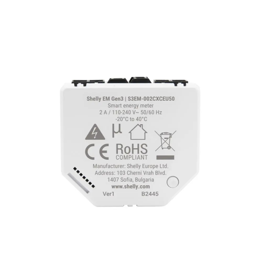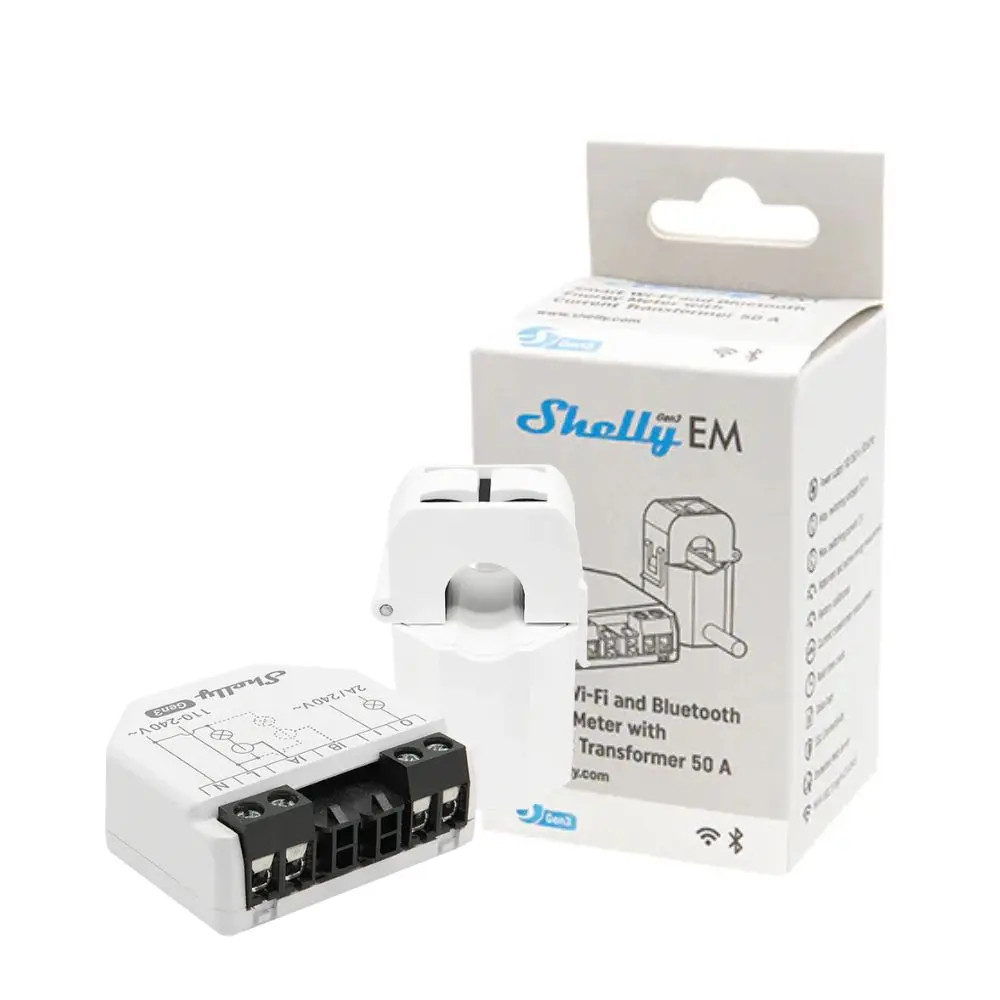 A Shelly EM Gen3 egy professzionális, kompakt méretű, okos fogyasztásmérő, amely lehetővé teszi a háztartások, vállalkozások és elektromos eszközök fogyasztásának valós idejű nyomon követését. Részletes információkat nyújt az energiafelhasználásról, hogy segítse a felhasználókat az energiafogyasztás optimalizálásában és a költségek csökkentésében. A terméknek része 1 db 50A áramváltó is, mellyel kontakt-mentes mérést végezhetsz.A Shelly EM Gen3 segítségével azt is mérheted, hogy mennyi energiát termel a napelemes rendszered, és egyidejűleg mérheted az energiafogyasztást is.Mivel Wi-Fi kapcsolatot használ az okos kommunikációhoz, nincs szükség helyi okosotthoni hubra, az ingyenes Shelly Clouddal Wi-Fi alapú internetkapcsolaton keresztül tud együttműködni.Kiemelt jellemzők:Wi-Fi és Bluetooth kapcsolatEgyfázisú, két áramkörös mérésAkár 2 áramváltó csatlakoztatása (érintés nélküli mérés), 1 áramváltó a termék részePotenciálmentes kapcsoló kontaktor vezérléséhezShelly IoT chip 8 MB memóriávalHelyi adatnaplók tárolása a készüléken akár 10 napig 1 perces időközönkéntOkos időzítések Valós idejű óraSzkriptelés, webhooks, MQTT, WebSocket, HTTP, RPC protokollok támogatásaSzéles körű integráció okosotthon és épület automatizálási rendszerekbeJövőbeli Matter szabvány kompatibilitás, gyári firmware frissítésselFigyeld az áramfogyasztást és optimalizáld a költségeket Az okos energiamérővel jobban megértheted az energia-felhasználod, és így jelentős energiamegtakarítást érhetsz el a Shelly automatizációkkal. Integráld a Shelly EM Gen3-at akár szabványos elektromos fali dobozokba, konnektorok, villanykapcsolók mögé vagy más, korlátozott helyű helyekre. Azzal, hogy megérted, hogy a mért készülékek hogyan és mikor használnak energiát, optimalizálhatod az energia-felhasználást, és csökkentheted a villanyszámláit.Főbb jellemzők:Két független áramkör mérése:Különböző áramkörök vagy készülékek egyidejű megfigyelését teszi lehetővé.Kontaktor vezérlés:Az elektromos rendszerek vezérlésének automatizálását és optimalizálását elősegítő kontaktorvezérlési funkciót tartalmaz 10A-ig terjedő terhelésekhez.Teljesítmény- és energiajelentések:A Shelly EM Gen 3 részletes mérőszámokat jelent, mint például a teljesítmény, a feszültség, az áram, a teljes energiafogyasztás és a teljesítménytényező, ami segíthet a felhasználóknak nyomon követni energiahatékonyságukat.Helyi adattárolás:A készülék akár 365 napig is képes tárolni az adatokat, így biztosítva az adatok folyamatos rendelkezésre állását.Csatlakoztathatóság:A készülék Wi-Fi hálózathoz kapcsolódik, így nincs szükség helyi okosotthoni hubra.Bluetooth: Gyors és egyszerű párosítás Bluetooth-on keresztül.Alkalmazás-integráció:A Shelly alkalmazáson keresztül vezérelheted és felügyelheted az eszközt, amely támogatja az olyan hangalapú asszisztenseket is, mint a Google Home és az Amazon Alexa.A Shelly EM Gen3 kompatibilis a különböző otthoni automatizálási platformokkal, és több kommunikációs protokollt is támogat (pl. MQTT, HTTP, WebSocket).Valós idejű értesítések:A felhasználók beállíthatják az energiafelhasználás küszöbértékeit, és értesítést kaphatnak, ha bizonyos határértékeket túllépnek, lehetővé téve a gyors beavatkozást.A Gen3 sorozat jellemzői:Úton a Matter feléMinden Gen3 készüléket úgy terveztek, hogy a Matter okosotthon szabvánnyal kompatibilis legyen a jövőben. A Plus sorozathoz képest megduplázott memória garantálja a zökkenőmentes frissítési folyamatot, megnyitva az utat az új okos képességek és integrációk előtt. A Matter kompatibilitáshoz a Shelly a jövőben firmware frissítéseket ad majd ki.Több memória, több teljesítményA Gen3 sorozat saját, nagy teljesítményű Shelly chip használatával biztosítja készülék magas minőségét és megbízhatóságát. A 8 MB memóriával büszkélkedő chip jelentősen javítja a készülék teljesítményét és hatékonyságát.Egységes vezérlés virtuális komponensekkelA Gen3 sorozat bevezeti a "virtuális komponenseket, átalakítva a harmadik féltől származó eszközök kezelését és vezérlését. A Shelly Smart Control alkalmazáson belül mostantól virtuális eszközöket hozhatsz létre, integrálva a nem Shelly termékeket egy egységes vezérlőrendszerbe.Működési módokFelhő üzemmód: Ebben az üzemmódban a készülék csatlakozik az ingyenes Shelly Cloud-hoz, amely a Shelly Cloud okostelefonos alkalmazáson (iOS és Android rendszerre egyaránt elérhető) és a https://my.shelly.cloud weboldalon keresztül vezérelhető és konfigurálható.Alternatívaként választható a LAN / helyi hálózati üzemmód is, ebben az esetben az eszközöket csak más, ugyanahhoz a helyi hálózathoz csatlakoztatott eszközökkel lehet vezérelni.A készüléket WiFi hozzáférési pont üzemmódban is működtetheti (a Wi-Fi kliens üzemmód helyett). Ha például a telepítés helyszínén nincs állandó WiFi hálózat, akkor a közelben lévő okostelefon vagy notebook segítségével közvetlenül csatlakozhat a készülék által sugárzott WiFi hálózatra, és e kapcsolat során vezérelheti a készüléket, vagy például leolvashatja az elmentett fogyasztási adatokat.Felhő üzemmódban a Shelly készülékek egymást is vezérelhetik (HA - AKKOR feltételekkel) a Shelly Cloud scenes funkció segítségével. Például egy Shelly teljesítménymérő a felhőn keresztül kapcsolhatja a Shelly reléket, vagyis az eszközök vezeték nélkül, WiFi-n és a felhőn keresztül vezérelhetik egymást a felhasználó által beállított szabályok szerint.Lehetőség van arra is, hogy az eszközök közvetlenül, HTTP parancsok segítség