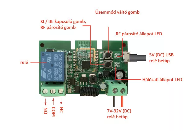 A SmartWise okoskapcsoló reléje ideális megoldás kertkapu, garázskapu, kapunyitók vezérlésére, vagy más elektromos eszközbe vagy áramkörökhöz építve azok távoli, interneten keresztüli vezérlésére. Ideális megoldást kínál többek között kapuzárak és elektromosan nyitható kapuk vagy PC tápegységek távoli vezérléséhez. A már korábban megjelent WiFi-s és WiFi+RF verziók után most megjelent a termék Zigbee+RF verziója is, mely kompatibilis mind az eWeLink platform Sonoff Zigbee Bridge-ével, mind a Tuya platform Zigbee átjáróival is. A kombinált Zigbee + RF támogatásnak köszönhetően a Zigbee kapcsolat és egy Zigbee átjáró segítségével az interneten keresztül távolról vezérelhető, időzíthető és automatizálható az eszköz, az RF vevőnek köszönhetően pedig Sonoff RF (fix kódos) RF távirányítókkal és a SmartWise RF fali kapcsolókkal távirányíthatjuk az eszköz közelében a relét.Sonoff Zigbee Bridge-el való használata esetén a SmartWise 5V-32V ZIgbee+RF okosvillamossági eszköz kompatibilis a Sonoff termékeket is vezérlő eWeLink mobiltelefon app-pal. Ez tehát egy olyan NO/NC kapcsolást is támogató relé, mellyel zárhatunk vagy meg is szakíthatunk áramköröket, időzíthetjük is a kapcsolást, és az interneten át is vezérelhetjük a relét és a rá kötött elektromos eszközt.A Zigbee-s okosrelé a működéséhez 5V USB (DC)-s vagy 7V-32V AC / DC közötti tápfeszültséget igényel.A kapcsolt áramkör a relé tápfeszültségétől független, a relé a COM bemenetre kötött 90-250V/10A váltóáramot vagy 0-30V/10A egyenáramot tud kapcsolni NO vagy NC üzemmódban is. Feszültség nélküli, azaz potenciál mentes, ún. száraz kontaktus kapcsolásra is alkalmas.Átállítható impulzuskapcsolási üzemmódba is, melyben 1 másodperc kapcsolás után megszakítja az áramkört, vagy 1 másodperc megszakítás után újra zárja az áramkört. Terméktulajdonságok:Zigbee + RF verzió - Zigbee-nek köszönhetően - Zigbee gateway-en keresztül - mobiltelefon app-ból kapcsolható az interneten át, az RF vevőn át pedig helyileg Sonoff és SmartWise 433 MHz-es (nem ugrókódos) RF távirányítókkal és RF fali kapcsolókkal is vezérelhető;A Zigbee része kompatibilis a Sonoff Zigbee Bridge eWeLink-es Zigbee átjáróval, illetve Tuya Zigbee átjáróval való használata esetén a Tuya / SmartLife platformmalRelé tápfeszültség: 5V DC USB vagy 7V-32V AC/DCVezérelt áramkör: feszültség-mentes száraz kontaktus vagy 90-250V/10A váltóáram vagy 0-30V/10A egyenáram is kapcsolható, (a relé tápfeszültségétől függetlenül)NO/NC bekötést és kapcsolást is támogat - a relé képes áramköröket zárni és megszakítani isMagyar nyelvű mobil App – Sonoff Zigbee Bridge és SmartWise Zigbee Bridge Pro esetén: ingyenes iOS és Android mobil App: eWeLink, magyar nyelven isÁllapotlekérdezés – A mobil App-ban látszik a relé aktuális állapota (be vagy kikapcsolt)Távvezérléssel való KI/BE kapcsolás – Bárhol is van, mostantól a mobiltelefon app-ból az interneten át távolról ki vagy be kapcsolhatja a relét (és a rá között eszközöket)Időzítés – Az eWeLink és a Tuya platformban is számos időzítési is funkció elérhető.Impulzus kapcsolás: beállítható a relé 1 másodperces impulzus kapcsolasra az alaplapon található üzemmód-váltó gombbal.Megosztható másokkal – Hozzáférést adhat pl. családtagjainak vagy másoknak a távvezérléshezOkosvezérlés (Scene) – Sonoff eWeLink ZIgbee Bridge esetén: az Okosvezérlés / Scene eWeLink app funkció segítségével létrehozhat különböző Sonoff / SmartWise eszközök közötti feltételes vezérléseket is. Például egy TH10 reléhez kapcsoló hőmérséklet vagy páratartalom érzékelő adatai alapján kapcsolhat egy Sonoff S26 konnektort, vagy egy Sonoff RF Bridge átjáróhoz párosított RF mozgásérzékelő jele alapján kapcsolhat egy Sonoff vagy SmartWise okos villanykapcsolót is, de két WiFi-s eszköz be és kikapcsolását is összehangolhatja (pl. egy Sonoff villanykapcsoló WiFi-n át bekapcsolhat egy Sonoff WiFi-s okoskonnektort).Kompatibilitás – Hozzákapcsolható hangvezérlés érdekében Amazon Alexa-hoz, Google Assistant-hoz, és Google Nest-hez is A termék két üzemmódban működik: normál kapcsolás és impulzus kapcsolás. A két üzemmód között az alaplapon található gomb segítségével lehet váltani.Megjegyzés: A Zigbee-s relé szoftveresen nem állítható be sem impulzuskapcsolásra, csak az alaplapon található üzemmód váltó gombbal. „NO” és „NC” típusú vezérléseket is beköthetsz vele:A relének három kimenete van:a „COM”, a bemenet, avagy az NC és az NO esetén közös pólus,az „NO”, azaz „Normally Open” = "Alaphelyzetben nyitott" ésaz „NC”, azaz „Normally Closed” = "Alaphelyzetben zárt". NO és COM bekötése esetén: az áramkör alapértelmezésben nyitva van, és a relé kapcsolásakor a COM (közös) és az NO pólus közötti áramkör záródik.NC és COM bekötése esetén: az áramkör alapértelmezésben zárva van (feszültség alatt van), és a relé kapcsolásakor szakad meg az áramkör. (Ez a bekötés használatos például olyan elektromos kapunyitók esetén, ahol a kapu az áramkör megszakadásakor nyílik.)