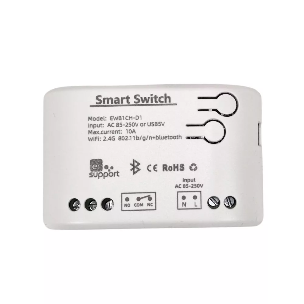A SmartWise 1 áramkörös okoskapcsoló reléje ideális megoldás kertkapu, garázskapu, kapunyitók vezérlésére, vagy más elektromos eszközbe vagy áramkörökhöz építve azok távoli, interneten keresztüli vezérlésére. Mint minden más SmartWise eszköz, a SmartWise 85V-250V okosvillamossági eszköz is kompatibilis a Sonoff termékeket is vezérlő eWeLink mobiltelefon app-pal. Ez tehát egy olyan WiFi-vel felszerelt, NO/NC kapcsolást is támogató relé, mellyel zárhatunk vagy meg is szakíthatunk áramköröket, időzíthetjük is a kapcsolást, és az interneten át is vezérelhetjük a relét és a rá kötött elektromos eszközt.Ez a Wi-Fi + eWeLink-Remote (Bluetooth) verzió, mely SmartWise eWeLink-Remote távirányítókkal és vezeték nélküli fali kapcsolókkal is ki/bekapcsolható. (Sonoff távirányítókkal nem kompatibilis) A Wi-Fi-s okosrelé a működéséhez 5V DC USB-s vagy 85V-250V AC közötti tápfeszültséget igényel.A kapcsolt áramkör a relé tápfeszültségétől független, a relé a COM bemenetre kötött 90-250V/10A váltóáramot vagy 0-30V/10A egyenáramot tud kapcsolni NO vagy NC üzemmódban is. Feszültség nélküli, azaz potenciál mentes, ún. száraz kontaktus kapcsolásra is alkalmas.Internet-kapcsolattal rendelkező iOS (Apple) vagy Android mobiltelefonon futó App segítségével távolról vezérelhetjük a kapcsolót, és beállíthatunk időzített ki/be kapcsolást is. Az App-ból való távoli elérés lehetősége megosztható a családtagokkal is.Kompatibilis Amazon Alexa és Google Assistant hangvezérléssel.Átállítható impulzuskapcsolási üzemmódba is (minden áramkör külön-külön), melyben pl. 1 másodperc kapcsolás után megszakítja az áramkört, vagy pl. 1 másodperc megszakítás után újra zárja az áramkört. Ennél a termékgenerációnál már az appban állíthatók ezek a beállítások.Terméktulajdonságok:Wi-Fi + eWeLink-Remote (Bluetooth) verzió - nem csak mobiltelefon app-ból kapcsolható az interneten át, hanem SmartWise eWeLink-Remote (BT) távirányítóval / fali kapcsolóival is vezérelhető.Vezérelt áramkörök száma: 1Relé működéséhez szükséges tápfeszültség: 5V DC USB vagy 85V-250V ACVezérelt áramkör: feszültség-mentes száraz kontaktus vagy 90-250V/10A váltóáram vagy 0-30V/10A egyenáram is kapcsolható, (a relé tápfeszültségétől függetlenül)NO/NC bekötést és kapcsolást is támogat - a relé képes áramköröket zárni és megszakítani isMagyar nyelvű mobil App – Ingyenes iOS és Android mobil App: eWeLink, magyar nyelven isÁllapotlekérdezés – A mobil App-ban látszik a relék aktuális állapota (be vagy kikapcsolt)Távvezérléssel való KI/BE kapcsolás – Bárhol is van, mostantól a mobiltelefon app-ból az interneten át távolról ki vagy be kapcsolhatja a relét (és a rá között eszközöket)Időzítés – Számos időzítési funkció elérhető: egy konkrét időpont beállítása, ismétlődő időpontok beállítása, visszaszámláló / timer, ciklus.Időzített kikapcsolás - beállítható a relé arra is, hogy minden bekapcsolás után bizonyos idővel automatikusan kikapcsoljonImpulzus kapcsolás: beállítható a relé impulzus kapcsolásra is, azaz egy megadott hosszúságú rövid kapcsolásra (pl. jellemzően 0,5 vagy 1 másodperc), a négy áramkör külön-külön beállítható erre.Megosztható másokkal – Hozzáférést adhat pl. családtagjainak vagy másoknak a távvezérléshezCsoportok, szobák - csoportokba és szobákba rendezheti Sonoff és SmartWise okoseszközeit az eWeLink app-banOkosvezérlés (Scene) – Az Okosvezérlés / Scene eWeLink app funkció segítségével létrehozhat különböző Sonoff / SmartWise eszközök közötti feltételes vezérléseket is. Például egy TH10 reléhez kapcsoló hőmérséklet vagy páratartalom érzékelő adatai alapján kapcsolhat egy Sonoff S26 konnektort, vagy egy Sonoff RF Bridge átjáróhoz párosított RF mozgásérzékelő jele alapján kapcsolhat egy Sonoff vagy SmartWise okos villanykapcsolót is, de két WiFi-s eszköz be és kikapcsolását is összehangolhatja (pl. egy Sonoff villanykapcsoló Wi-Fi-n át bekapcsolhat egy Sonoff WiFi-s okoskonnektort).Kompatibilitás – Hozzákapcsolható hangvezérlés érdekében Amazon Alexa-hoz, Google Assistant-hoz, és Google Nest-hez isA Sonoff és testvérmárkája, a SmartWise eszközök egymással kompatibilisek, egyaránt az eWeLink gyári app-ot használják.Az eWeLink app már magyar nyelven is elérhető!„NO” és „NC” típusú vezérléseket is beköthetsz vele:A relének három kimenete van:a „COM”, a bemenet, avagy az NC és az NO esetén közös pólus,az „NO”, azaz „Normally Open” = "Alaphelyzetben nyitott" ésaz „NC”, azaz "Normally Closed" = "Alaphelyzetben zárt".NO és COM bekötése esetén: az áramkör alapértelmezésben nyitva van, és a relé kapcsolásakor a COM (közös) és az NO pólus közötti áramkör záródik.NC és COM bekötése esetén: az áramkör alapértelmezésben zárva van (feszültség alatt van), és a relé kapcsolásakor szakad meg az áramkör. (Ez a bekötés használatos például olyan elektromos kapunyitók esetén, ahol a kapu az áramkör megszakadásakor nyílik.)