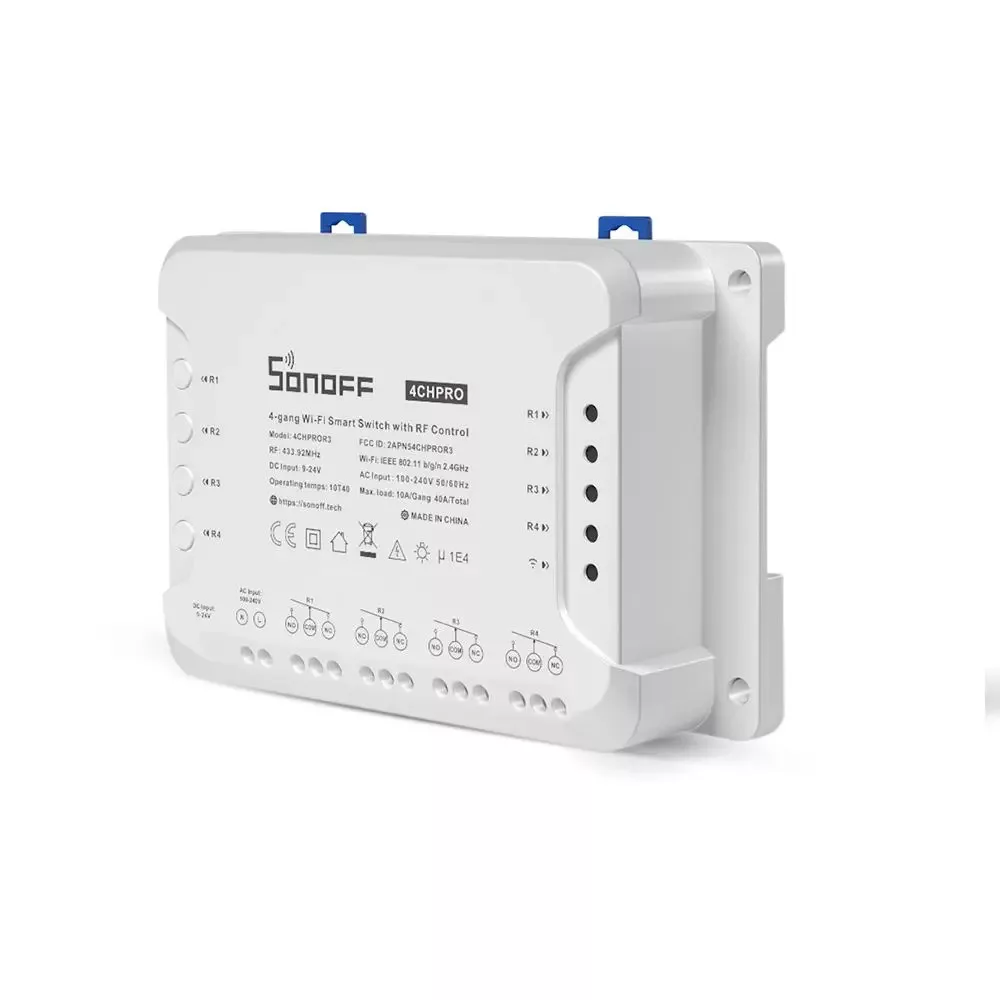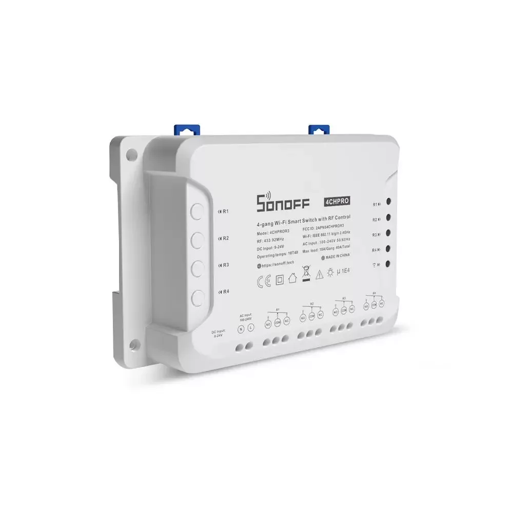 A Sonoff 4CH PRO a Sonoff négyáramkörös okos kapcsolóreléjének a bővebb funkcionalitású, "PRO" változata, az "R3" pedig a termék legújabb 2020. júliusban megjelent verzióját jelöli.A termék a beépített WiFi chip segítségével a helyi WiFi routeren keresztül kapcsolódik a felhőhöz és ezen keresztül az interneten keresztül távolról is vezérelhető, és időzíthető is. A RF-vevőnek köszönhetően a relé 20-50 méteres környezetében Sonoff RF távirányítókkal is kapcsolható, a 4 áramköre természetesen külön-külön.Elterjedten használják nem csak 4 független 230V AC áramkör (világítás, konnektorok) vezérlésére, hanem pl. 24V AC-s locsolórendszerek vezérlésére is. Reteszelő funkciójának köszönhetően alkalmas 24V DC-s tápfeszültségű, feszültség nélküli százaz-kontakt kapcsolást igénylő kapunyitók vagy garázskapuk vezérlésére is, illetve redőnyök, árnyékolók és más kétirányú motorok vezérlésére is.Internet-kapcsolattal rendelkező iOS (Apple) vagy Android mobiltelefonon futó App segítségével távolról is vezérelhetjük a kapcsolót, és beállíthatunk időzített ki/be kapcsolást is. Az app-on keresztüli távoli elérés lehetősége megosztható másokkal is. Tökéletes megoldás háztartási elektromos eszközök okos vezérlésére, melyeknek nem szükséges állandóan működnie, szakaszosan kell ki/be kell kapcsolni (pl. akvárium keringető vagy levegőztető). Használatával kényelmesen távolról is bekapcsolhatjuk a kívánt készülékeket még mielőtt hazaérnénk, és kényelmesen időzíthetünk vele kikapcsolást is, hogy energiát és költséget takarítsunk meg.A négy csatorna úgynevezett interlock, azaz reteszelő üzemmódba is kapcsolható, melyben az egyik áramkör kapcsolásakor a többi 3 áramkört kikapcsolja a relé, így forgómotorok vezérlésére is használható ebben az üzemmódban!A Sonoff 4CH Pro vezérelt áramkörei függetlenek a relé működéséhez szükséges tápfeszültségtől, és így feszültség nélküli ún. száraz kontakt kapcsolásra, illetve 5-24V DC kapcsolására is alkalmas.A Sonoff 4CH Pro R3 - elődjéhez hasonlóan szintén felerősíthető villamossági szekrényben levő szabványos DIN-sínre. A 4CH Pro R3 verzió újdonságai a korábbi a 4CH Pro R2-höz képest:A 433.92 MHz-es RF / rádiós vezérlés terén az R3 verzió akár már 4 db RF távirányítóval vagy RF-es kapcsolóval is párosítható és kapcsolható (míg az R2 verzió minden csatornája csak egy távirányítóval volt párosítható)Az impulzuskapcsolási üzemmód az eWeLink app-ban állítható be az R3 verzióban, míg az R2 verzióban az alaplapon fizikai kapcsoló kezelte ezt (és az újabb eWeLink verzióban app-ban is állítható volt opcionálisan már)A reteszelő / normál üzemmód szintén az eWeLink app-ban állítható be az R3 verzióban, míg az R2 verzióban az alaplapon fizikai kapcsoló kezelte ezt (és az újabb eWeLink verzióban app-ban is állítható volt opcionálisan már)Az auto-off / inching funkciószintén az eWeLink app-ban állítható be az R3 verzióban (0,5-3600 másodperc között), míg az R2 verzióban az alaplapon fizikai kapcsoló kezelte ezt (1-16 másodperc közötti értékekkel)Csavaros, erősebb vezetékrögzítésR3 verzióban jelentősen megnövelt maximális teljesítmény: 10A/2200W/áramkör, 40A/8800W/összesen További terméktulajdonságok:Távvezérléssel való KI/BE kapcsolás – Bárhol is van, mostantól távolról ki vagy be kapcsolhatja a rá kötött elektromos eszközöket.Négy áramkört támogat - négy relé egyben, négy áramkör egymástól független kapcsolása egy eszközön belülAC és DC tápellátásról is működik, min. 0,5A teljesítményt igényel a működéséhezVillamossági szekrény DIN-sínjére illeszthető.A négy áramkör külön-külön vezérelhető a mobil app-bólA relé működéséhez szükséges tápfeszültségtől független vezérelt áramkörök, akár feszültségmentes szárazkontakt kapcsolásra is alkalmas.Impulzuskapcsolási üzemmód is támogatott a 0,5 másodperc és 1 óra között beállítható auto-off / inching funkció segítségévelReteszelő üzemmódba is kapcsolható, melyben az egyik áramkör bekapcsolásakor a többi 3 áramkört kikapcsolja a relé, így forgómotorok vezérlésére is használhatóFizikai nyomógombok a négy áramkör manuális kapcsolására.Kompatibilis RF távirányítóval: mind a négy csatorna külön-külön vezérelhető RF távirányítóval:a Sonoff 4CH Pro R3 (az R2 verzióval ellentétben) csatornánként már több (4 db) távirányítót is képes párosítani: pl. kompatibilis vele a Sonoff 4 gombos távirányítója / Sonoff 8 gombos asztali / fali távirányítója vagy a SmartWise fali RF kapcsolói mind képesek távvezérelni.Mobil App – Ingyenes iOS és Android mobil App: eWeLinkÁllapotlekérdezés – A mobil App-ban látszik a kapcsoló relé aktuális állapota (be vagy kikapcsolt)Időzítés – Számos időzítési funkció elérhető: egy konkrét időpont beállítása, ismétlődő időpontok beállítása, visszaszámláló / timer.Megosztható másokkal – Hozzáférést adhat pl. családtagjainak a távvezérléshezKészülékcsoportok – Csoportba rendezheti készülékeit, és egy kattintással többet is ki vagy bekapcsolhatOkoscsoportok – Hőmérséklet, páratartalom vagy más külső érzékelőkhöz kapcsolva akár automatikusan is vezérelheti a ki/be kapcsolástKompatibilitás – Hozzákapcsolható hangvezérlés érdekében Amazon Alexa-hoz, Google Assistant-hoz, valamint IFTTT-hez és Google Nest-hez is.