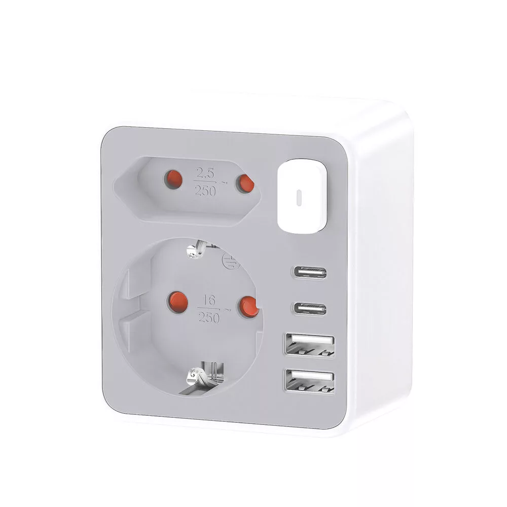 A Techlink TPA35 egy két aljzatos, kapcsolóvalellátott elosztóadapter, amely 4 USB-töltőporttal (2×USB-A és2×USB-C) is rendelkezik.