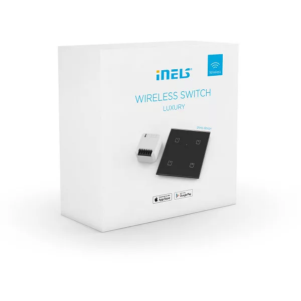 Négycsatornás érintőgombos fekete, szögletes sarkú üveg vezérlő és egyfunkciós kapcsolóegység (két gombos be/ki) kombinációja készülékek vezérléséhez.