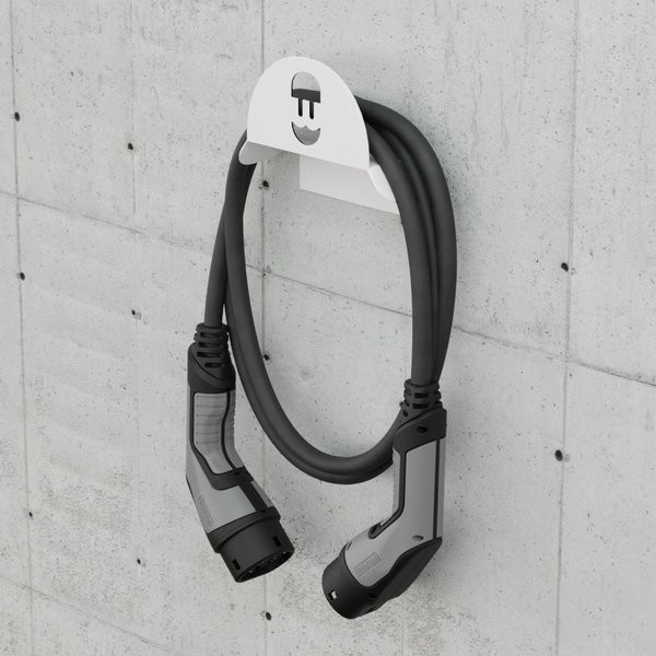 Praktikus, falra szerelhető Wallbox kábel tartó fehér színben, amely segít rendezetten és biztonságosan tárolni az elektromos autó töltőkábelét. Csökkenti a kábel sérülésének kockázatát, megakadályozza a megtörést és a földön heverő vezeték okozta rendetlenséget. Esztétikus megjelenésével diszkréten illeszkedik a garázs vagy a parkoló környezetébe.