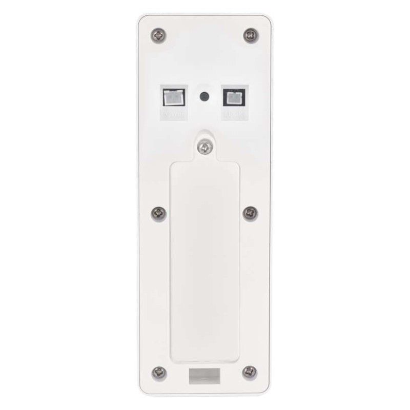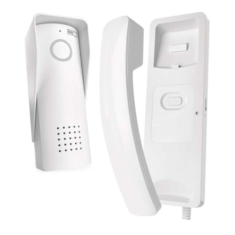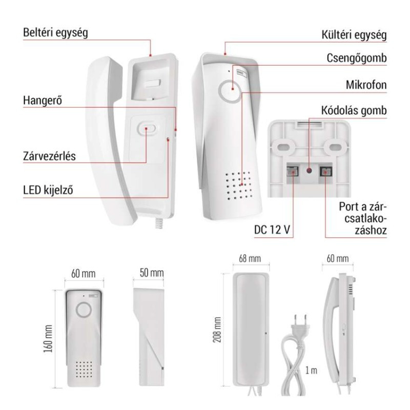 a csomagolás része: –|a fülhallgató anyaga: műanyag|a fülhallgató mérete: 208 × 68 × 60 mm|a nyomógombok és a beltéri egységek száma: 1|az ajtóállomás mérete: 160 × 60 × 50 mm|az ajtópanel anyaga: műanyag|dallamok száma: 1|értékesítési csomagolás: 1 db, kis papír doboz|fülhallgatók száma: –|hangerőszabályzó: igen|háttérvilágítású kijelző: nem|hely a névcímkéknek: igen|javasolt kábelezés: vezeték nélküli|szerelés: falra + állványra|szín: fehér|táplálás: 100–230 V, 12 V DC|tartozék tápegység: igen|termék: kaputelefon készlet|vezetékek száma (képernyő / zár / kapu): –|zár és kapunyitó vezérlése: csak ajtózár